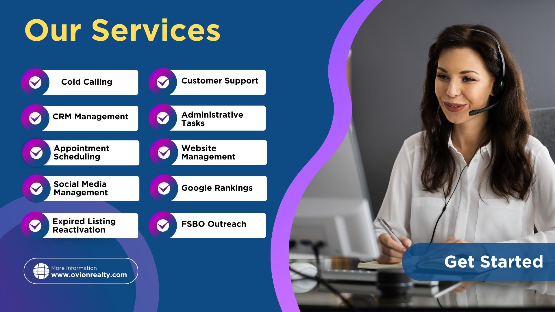At Ovion Realty, we help real estate agents like you save time, close more deals, and stay organized with expert virtual support in cold calling, CRM, customer service, admin, and more.